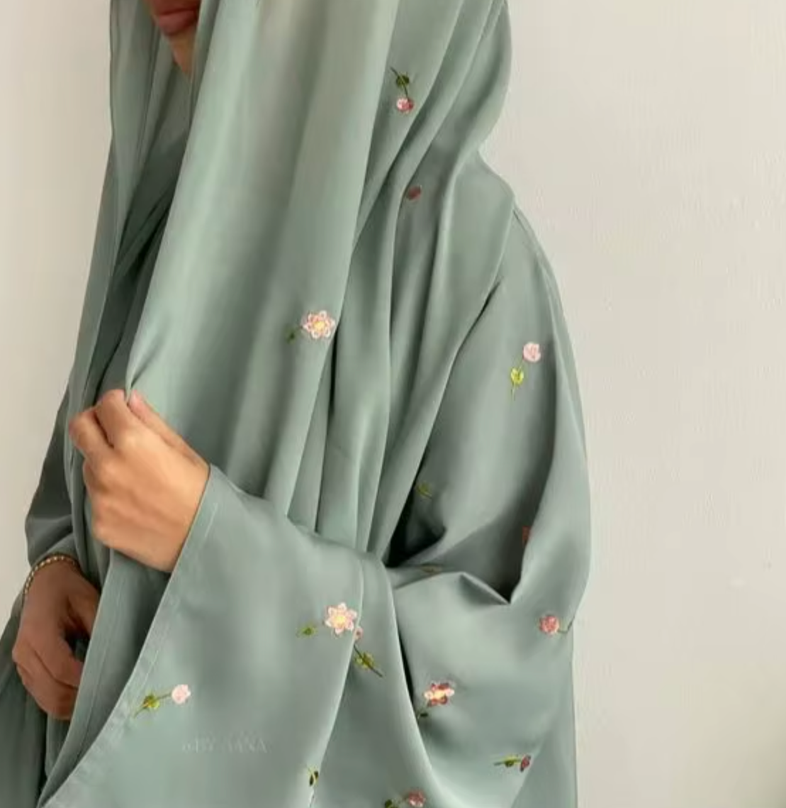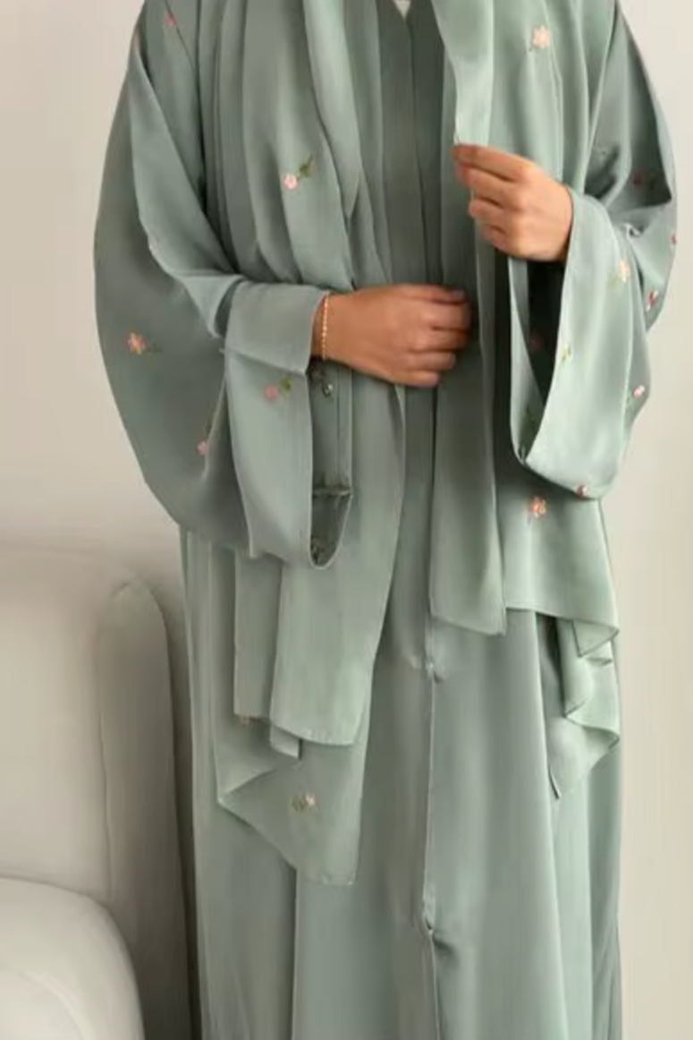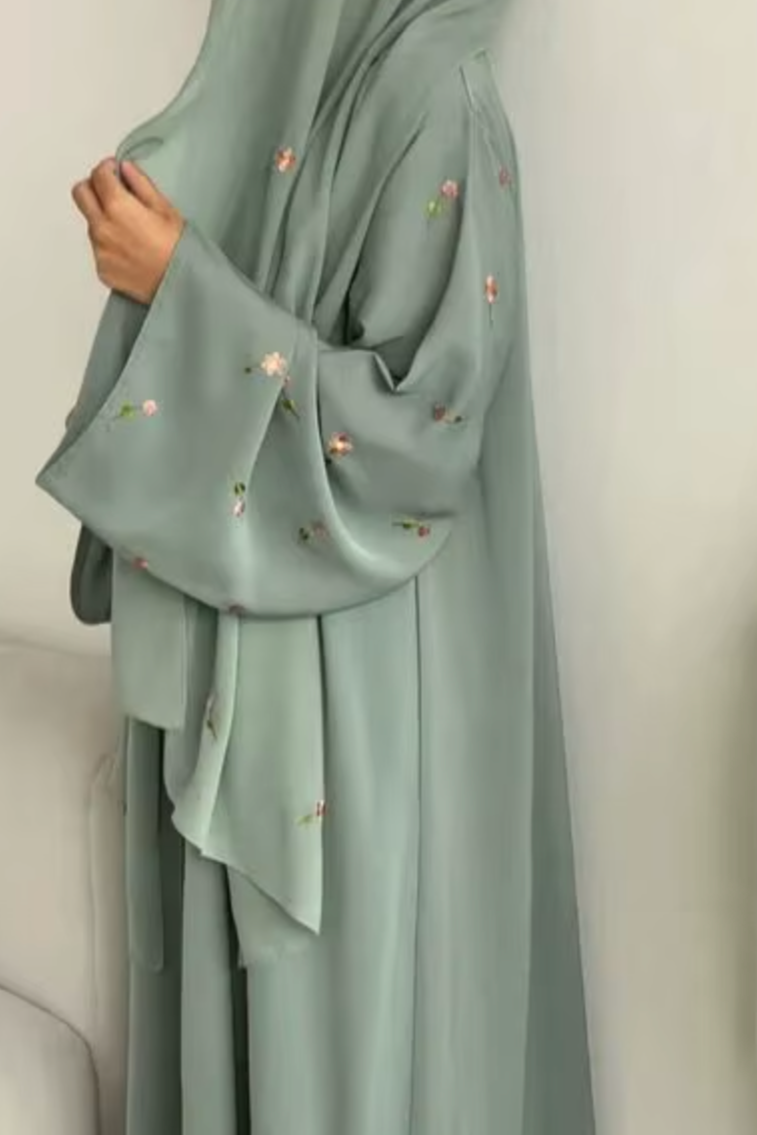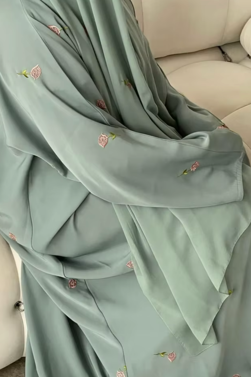 Une robe douce d'un vert tendre, rehaussée de petites broderies florales délicates, avec son voile.