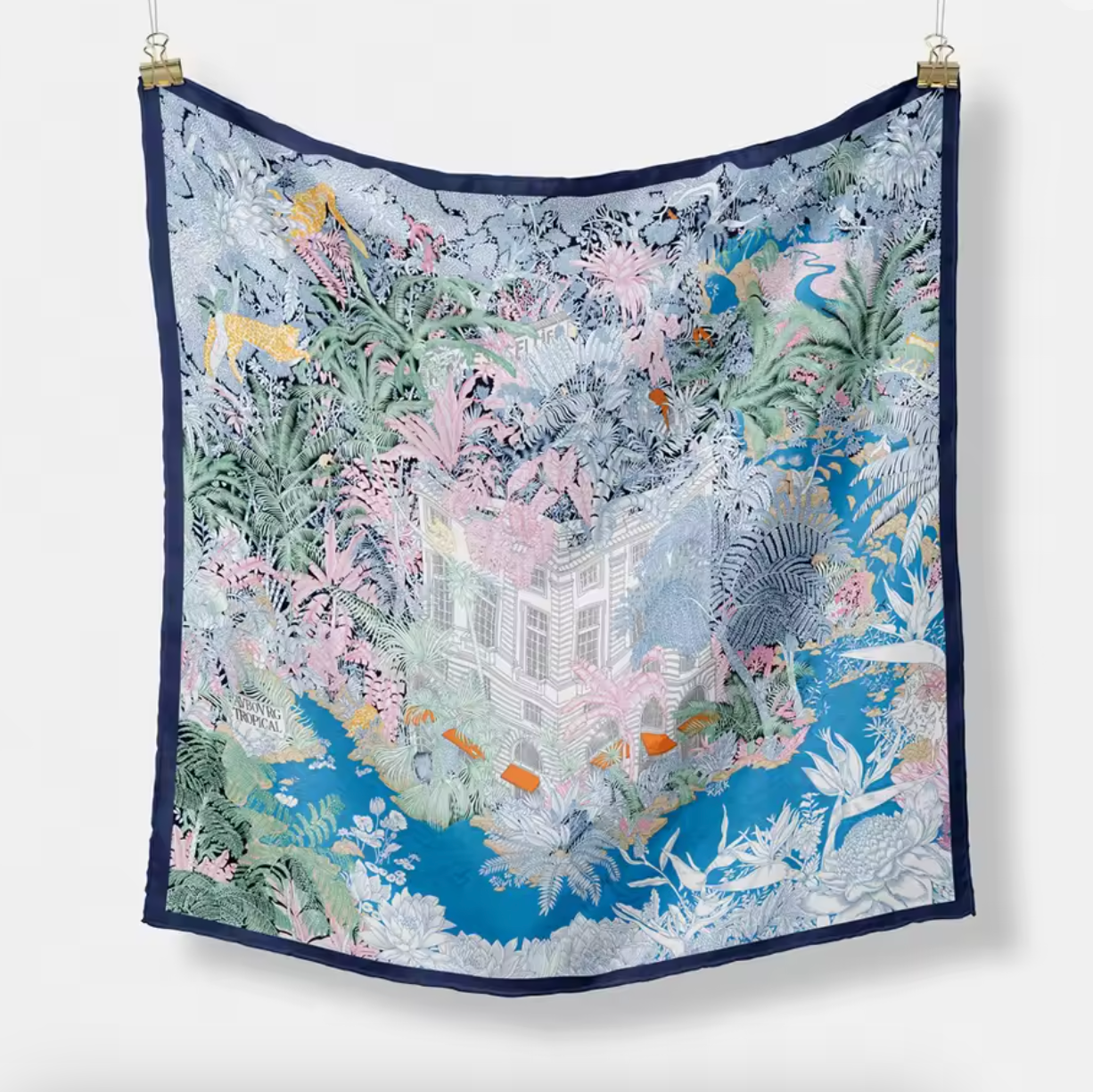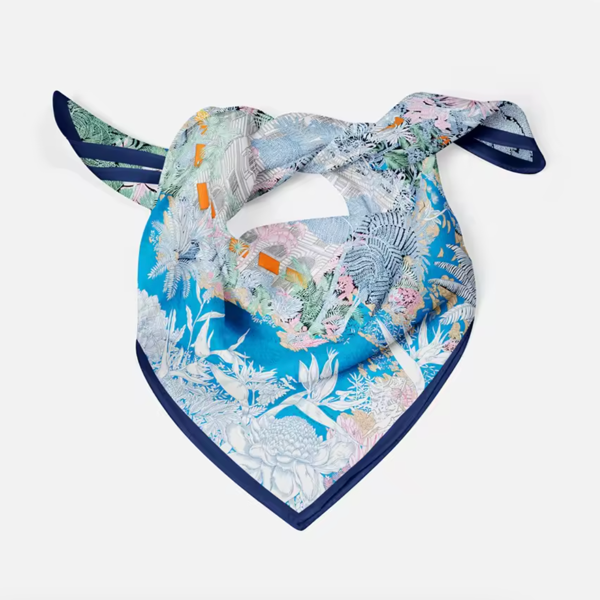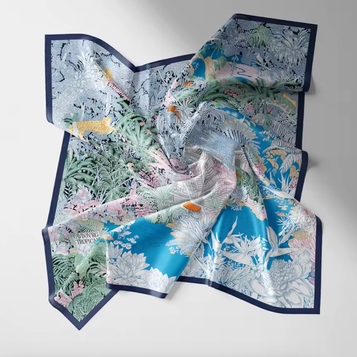 Un foulard soyeux aux motifs tropicaux éclatants. Polyvalent et élégant, il sublime vos looks avec fraîcheur et raffinement.
