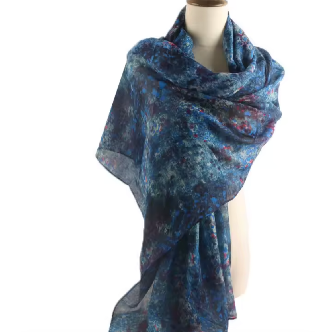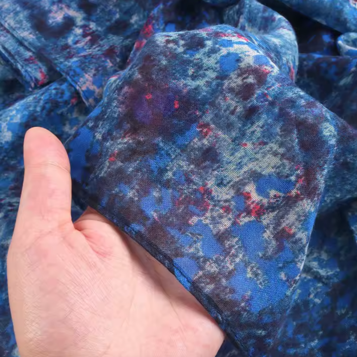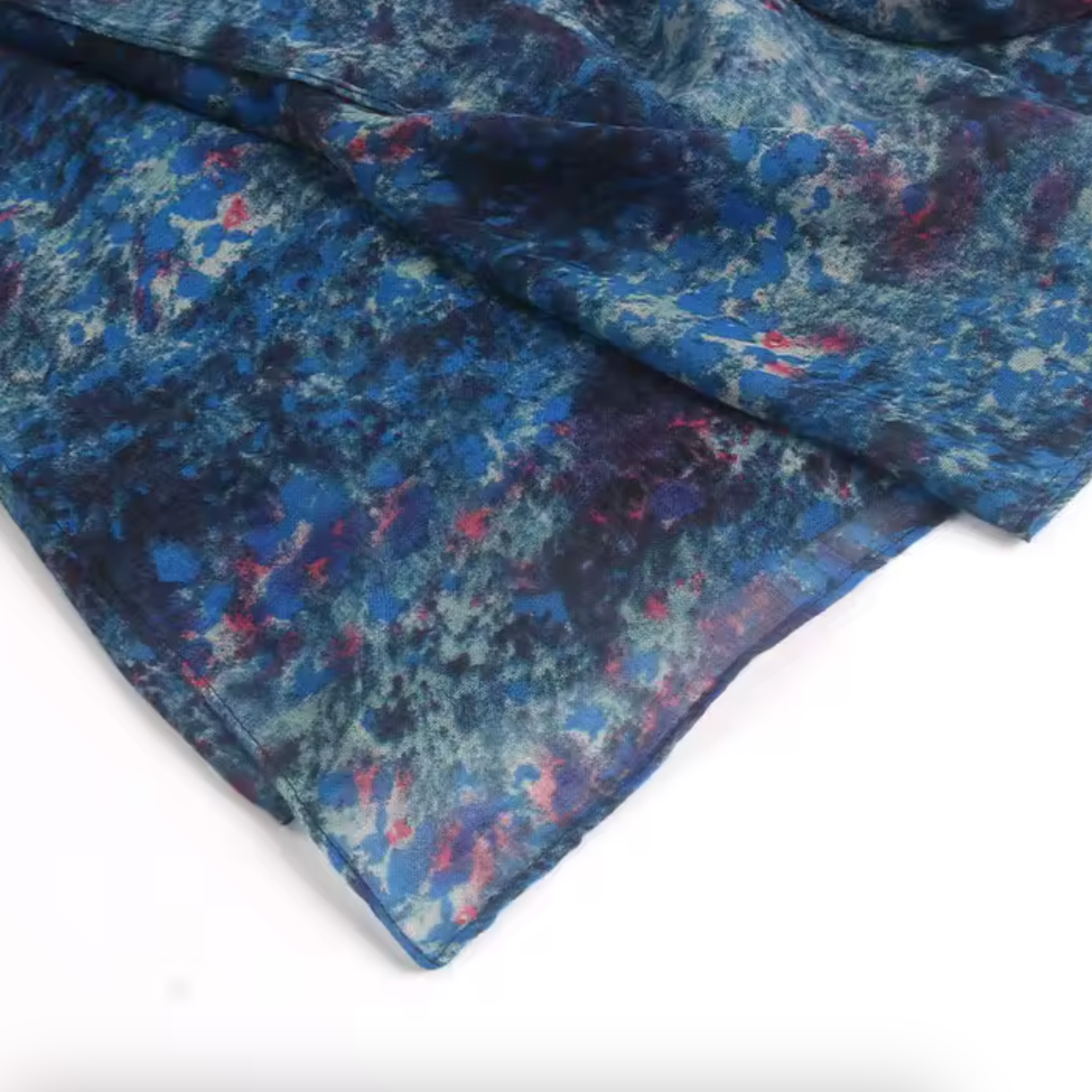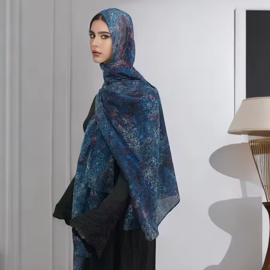 Un hijab bleu profond parsemé de nuances rouges et azur, rappelant un jardin étoilé. Léger, fluide et élégant en toute occasion.
