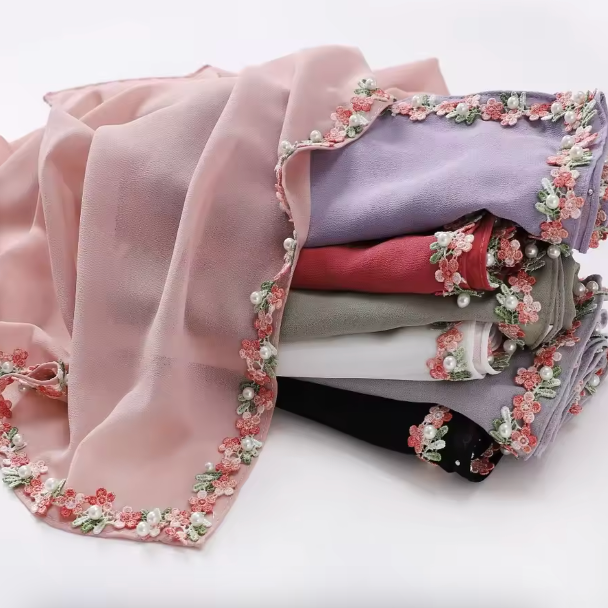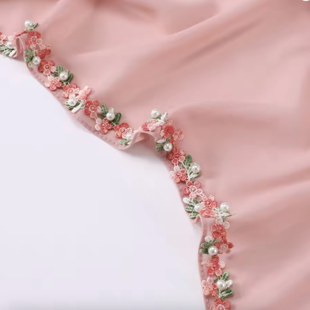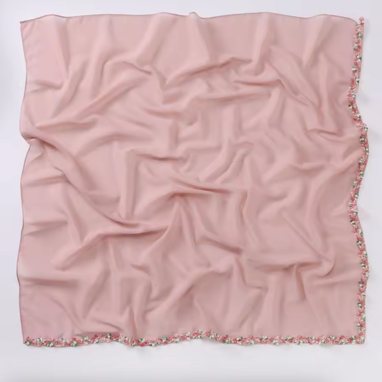 Un foulard délicat dans une teinte rose poudré, orné de fleurs en perles raffinées. Léger et élégant, il apporte une touche de douceur florale et de féminité à chaque tenue.