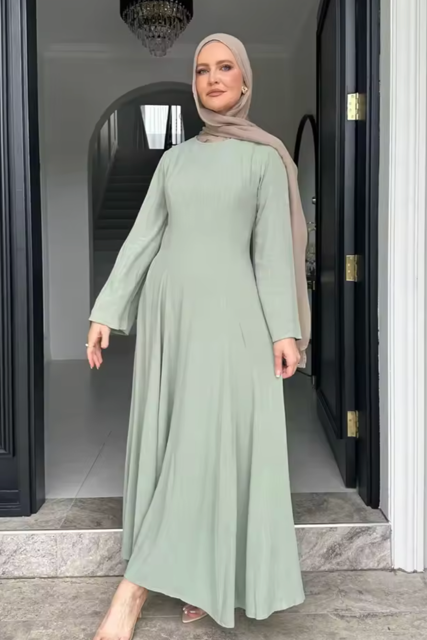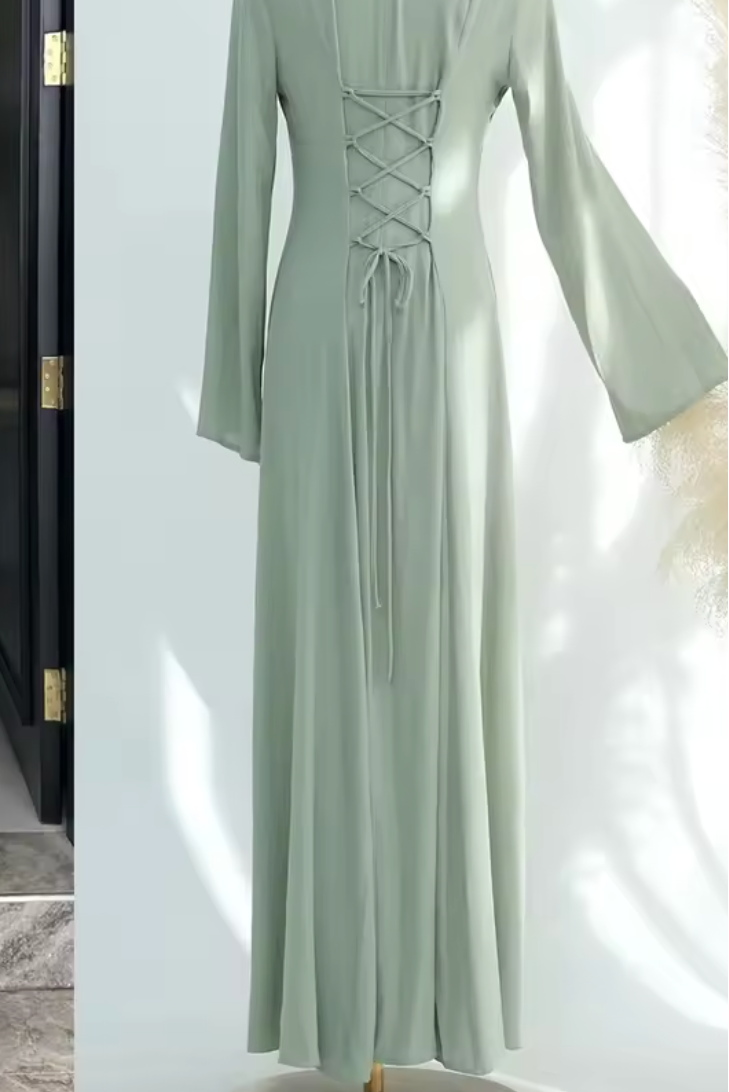 Robe fluide vert sauge, aux manches évasées et au laçage délicat dans le dos, rappelant la fraîcheur d’un jardin en fleurs et la légèreté des beaux jours.